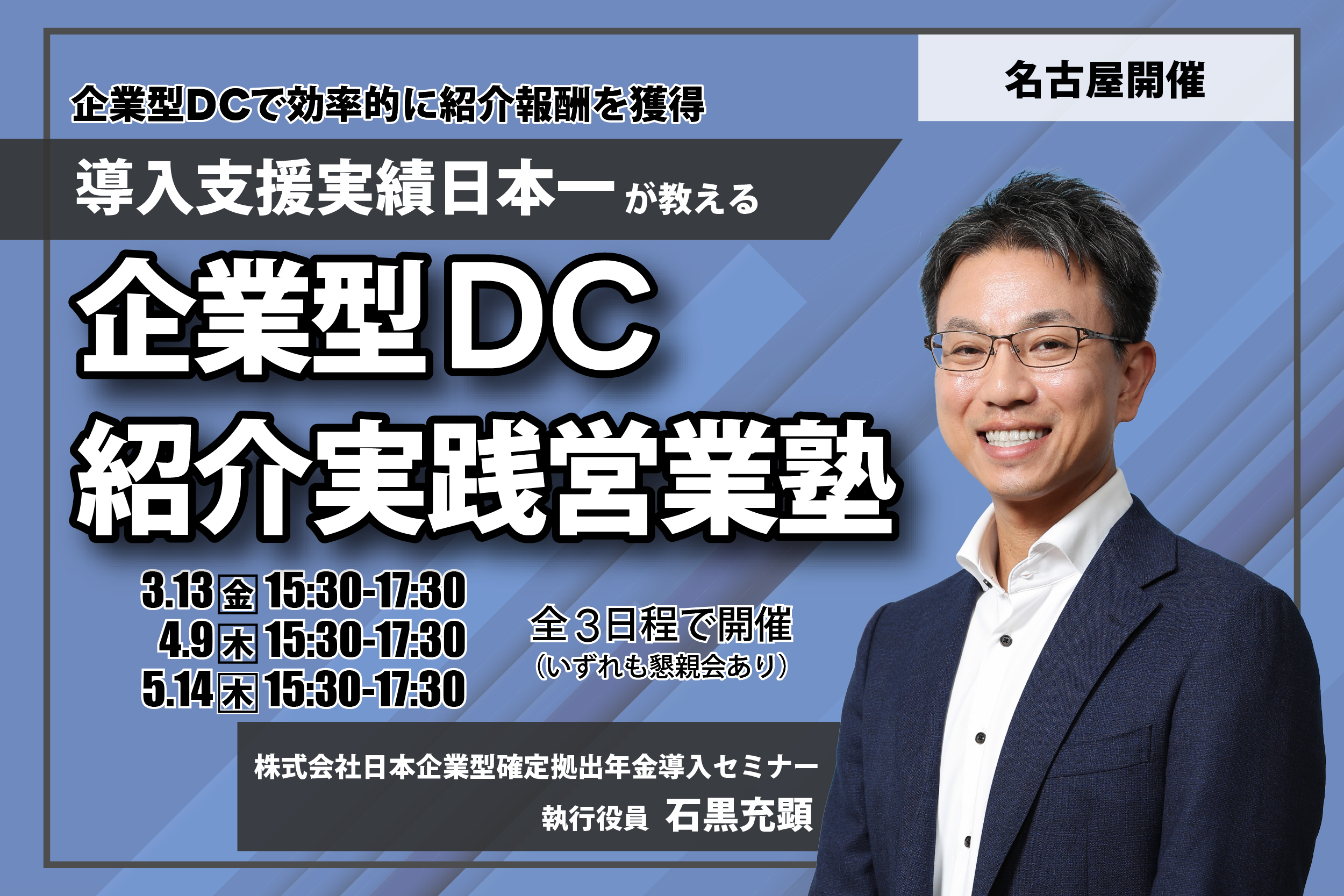 企業型DC紹介実践営業塾 2025.12.18 2025.12.19 企業型DC紹介実践営業塾 ※名古屋にてリアル開催 企業型DC紹介実践営業塾は、このような方におすすめです。 ・より効率的に紹介数を増やしたい方 ・中小企業に企業型DCが最適な理由を再確認したい方 ・節税の全体像を把握したい方 ・提案の構造を理解したい方 企業型DCの制度は知っているが、「どう切り出せばいいか」「どのタイミングで提案すべきか」に悩んでいませんか? 本塾は、顧問先への付加価値を最大化し、迷いなく紹介数を増やせるようになるための実践型カリキュラムです。 単なる知識の習得ではなく、明日から現場で使える「提案の型」を全3日程でマスターしていただけます。 セミナー詳細 セミナー名 企業型DC紹介実践営業塾 対象 弊社と紹介パートナー契約を結んでいる税理士事務所・社労士事務所・保険代理店 日時 1日目:2026年3月12日(木)15:30~17:30(懇親会 18:00~20:00) 2日目:2026年4月9日(木)15:30~17:30(懇親会 18:00~20:00) 3日目:2026年5月14日(木)15:30~17:30(懇親会 18:00~20:00) 参加費 無料 定員 10名 開催場所 株式会社日本企業型確定拠出年金センター 名古屋駅前事務所 〒450-0002 愛知県名古屋市中村区名駅三丁目4番10号 アルティメイト名駅1st 3階 お問い合わせ [email protected] 講師紹介 ■ 石黒充顕株式会社日本企業型確定拠出年金センター執行役員 企業型DC導入支援グループマネージャーDCプランナー2級 企業年金管理士 確定拠出年金ガイド(SBI Benefit Systems認定資格)日本企業型確定拠出年金センターの立ち上げから事業化に関わり、自身も400社以上の企業に企業型DCを導入している。 導入支援の多くは税理士・社労士・保険代理店様からの紹介・協業であることから、各事業所様の顧問先への付加価値向上を支援しています。 セミナーのお申し込みはこちら お問合せ・ご相談はこちら お気軽にお問合せください 営業時間:9:00〜17:00休業日:土曜・日曜・祝日 お電話でのお問い合わせはこちらTEL:050-3645-9040※導入に関するご相談を承っております。個人の方の質問はお答えできませんのでご了承ください。 知らないと後悔する!勤怠管理システム対策セミナー ~...