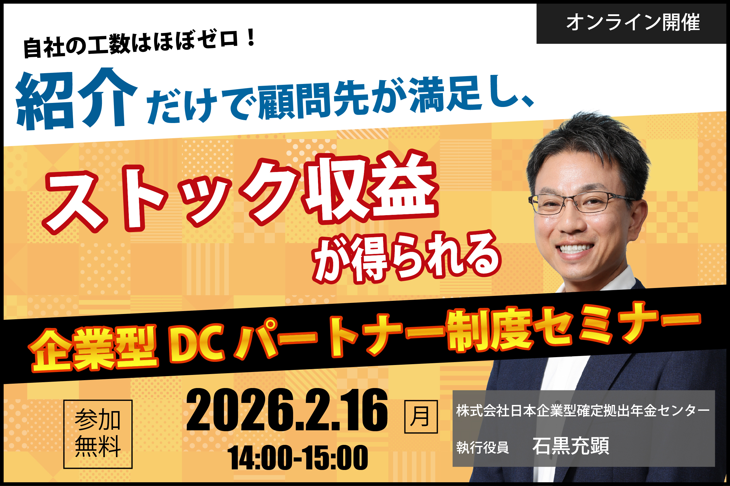 自社の工数はほぼゼロ!紹介だけで顧問先が満足し、ストック収益が得られる企業型DCパートナー制度セミナー 2025.12.17 2026.01.19 自社の工数はほぼゼロ!紹介だけで顧問先が満足し、ストック収益が得られる企業型DCパートナー制度セミナー ※Zoomにてオンライン開催 自社の工数はほぼゼロ!紹介だけで顧問先が満足し、ストック収益が得られる企業型DCパートナー制度セミナーは、このような方におすすめです。 ・顧問先から「節税」の相談を受けており、良い提案を探している方 ・自社の作業負担は「ほぼゼロ」のまま、顧問先に喜ばれる商材を取り扱いたい方 ・導入後の投資教育やフォローまで丸投げできる、安心なパートナーをお探しの方 紹介パートナーは、弊社に企業型確定拠出年金の見込み先をご紹介いただく契約です。 企業型確定拠出年金の提案や導入のサポートの一切を弊社が実施いたします。導入が決まれば、弊社からパートナーの皆様に継続的な報酬と一時金のお支払いをいたします。 企業型確定拠出年金を新規顧客の開拓や顧客満足度アップにつなげたいという方におすすめのパートナー契約です。 本セミナーでは、税理士事務所・社労士事務所向けに、延べ1,200社以上の導入支援を行ってきた弊社の実績をもとに、企業型確定拠出年金の概要とパートナー制度の詳細について解説いたします。 セミナー詳細 セミナー名 自社の工数はほぼゼロ!紹介だけで顧問先が満足し、ストック収益が得られる企業型DCパートナー制度セミナー 対象 税理士事務所・社労士事務所・保険代理店の方 日時 2026年2月16日(月)14:00~15:00 参加費 無料 参加方法 Zoom(オンライン) お問い合わせ [email protected] 講師紹介 ■ 石黒充顕株式会社日本企業型確定拠出年金センター執行役員 企業型DC導入支援グループマネージャーDCプランナー2級 企業年金管理士 確定拠出年金ガイド(SBI Benefit Systems認定資格)日本企業型確定拠出年金センターの立ち上げから事業化に関わり、自身も400社以上の企業に企業型DCを導入している。商工会議所や工事組合をはじめ多数の税理士法人で職員向け及び顧客向けにセミナーを実施している。 自身の出演するYouTube『DCチャンネル』は専門チャンネルでありながら5,000名を超える登録者を誇っている。 NewsPicksやヒロ税理士、マキノヤ先生など動画出演も多数している。 セミナーのお申し込みはこちら お問合せ・ご相談はこちら お気軽にお問合せください 営業時間:9:00〜17:00休業日:土曜・日曜・祝日 お電話でのお問い合わせはこちらTEL:050-3645-9040※導入に関するご相談を承っております。個人の方の質問はお答えできませんのでご了承ください。 社労士が知っておくべき確定拠出年金の最新法改正!~企... 知らないと後悔する!勤怠管理システム対策セミナー ~...