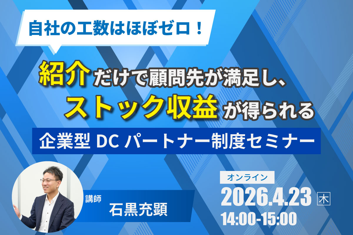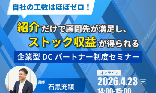 自社の工数はほぼゼロ!紹介だけで顧問先が満足し、ストック収益が得られる企業型DCパートナー制度セミナー 2025.12.17 2026.03.16 自社の工数はほぼゼロ!紹介だけで顧問先が満足し、ストック収益が得られる企業型DCパートナー制度セミナー ※Zoomにてオンライン開催 自社の工数はほぼゼロ!紹介だけで顧問先が満足し、ストック収益が得られる企業型DCパートナー制度セミナーは、このような方におすすめです。 ・顧問先から「節税」の相談を受けており、良い提案を探している方 ・自社の作業負担は「ほぼゼロ」のまま、顧問先に喜ばれる商材を取り扱いたい方 ・導入後の投資教育やフォローまで丸投げできる、安心なパートナーをお探しの方 紹介パートナーは、弊社に企業型確定拠出年金の見込み先をご紹介いただく契約です。 企業型確定拠出年金の提案や導入のサポートの一切を弊社が実施いたします。導入が決まれば、弊社からパートナーの皆様に継続的な報酬と一時金のお支払いをいたします。 企業型確定拠出年金を新規顧客の開拓や顧客満足度アップにつなげたいという方におすすめのパートナー契約です。 本セミナーでは、税理士事務所・社労士事務所向けに、延べ1,200社以上の導入支援を行ってきた弊社の実績をもとに、企業型確定拠出年金の概要とパートナー制度の詳細について解説いたします。 セミナー詳細 セミナー名 自社の工数はほぼゼロ!紹介だけで顧問先が満足し、ストック収益が得られる企業型DCパートナー制度セミナー 対象 税理士事務所・社労士事務所・保険代理店の方 日時 2026年4月23日(木)14:00~15:00 参加費 無料 参加方法 Zoom(オンライン) お問い合わせ [email protected] 講師紹介 ■ 石黒充顕株式会社日本企業型確定拠出年金センター執行役員 企業型DC導入支援グループマネージャー・DCプランナー2級 ・AFP(2級ファイナンシャル・プランニング技能士) ・企業年金管理士 ・確定拠出年金ガイド(SBI Benefit Systems認定資格) ・情報セキュリティマネジメント試験合格 ・知的財産管理技能検定3級 ・グーグルデジタルワークショップ修了 ・給与計算実務能力検定2級日本企業型確定拠出年金センターの立ち上げから事業化に関わり、自身も400社以上の企業に企業型DCを導入している。商工会議所や工事組合をはじめ多数の税理士法人で職員向け及び顧客向けにセミナーを実施している。 自身の出演するYouTube『DCチャンネル』は専門チャンネルでありながら5,000名を超える登録者を誇っている。 NewsPicksやヒロ税理士、マキノヤ先生など動画出演も多数している。 セミナーのお申し込みはこちら お問合せ・ご相談はこちら お気軽にお問合せください 営業時間:9:00〜17:00休業日:土曜・日曜・祝日 お電話でのお問い合わせはこちらTEL:050-3645-9040※導入に関するご相談を承っております。個人の方の質問はお答えできませんのでご了承ください。 社労士が知っておくべき確定拠出年金の最新法改正!~企... 知らないと後悔する!勤怠管理システム対策セミナー ~...